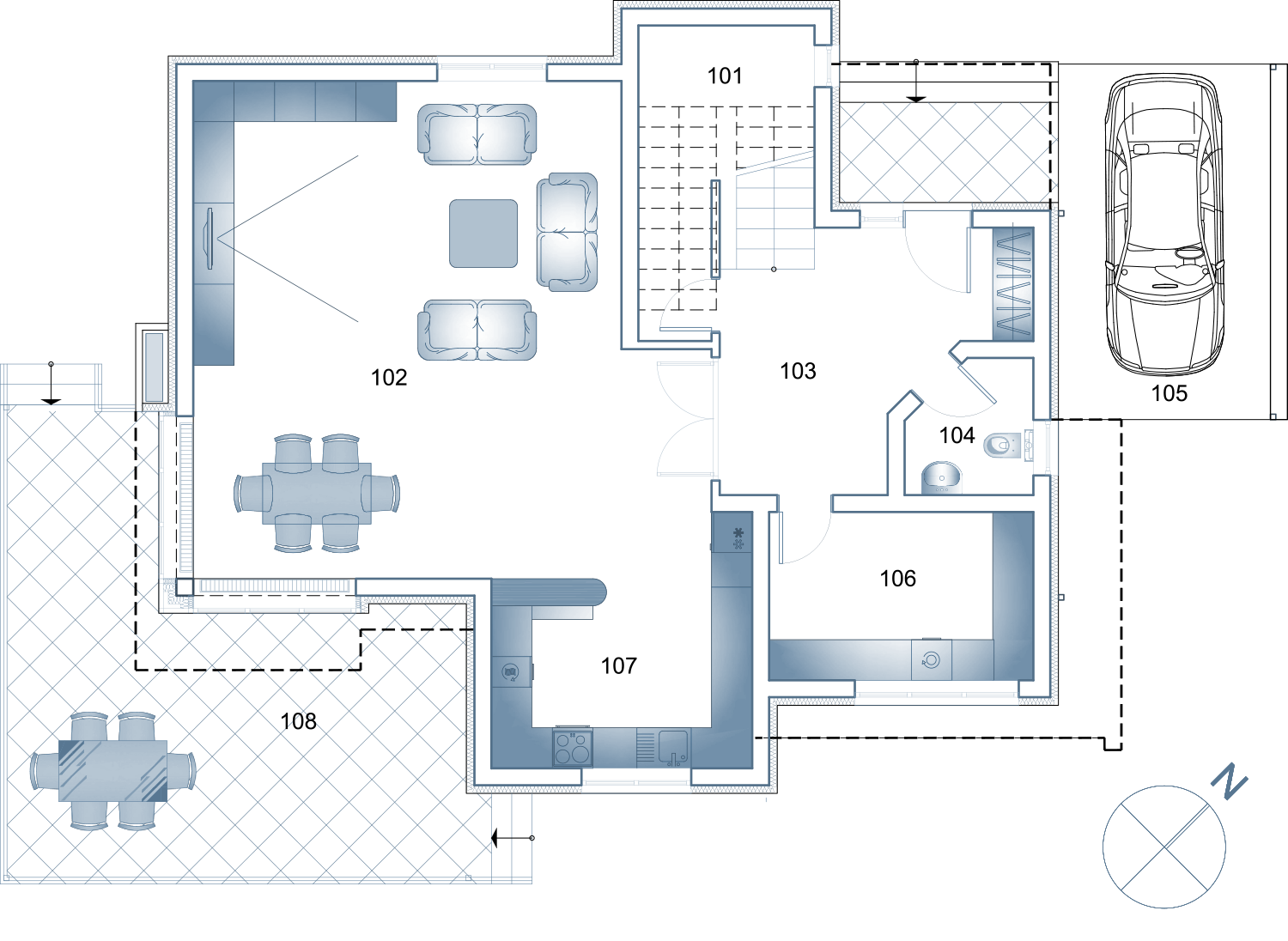 Exterior shutters cover the windows tightly when necessary. The sliding shutter system is hidden in the wall cladding this way preserving the simplicity and elegance of the house facade. The architects managed to achieve maximum daylight penetration in all interior spaces. The first-floor plan follows modern house layout guidelines by focusing on the continuous interior space. The feeling of freedom in the living spaces is enhanced by the 3.3 m room height of the first floor, while the large distance between the houses (a minimum of 10 m) ensure an all-day access to natural light.
