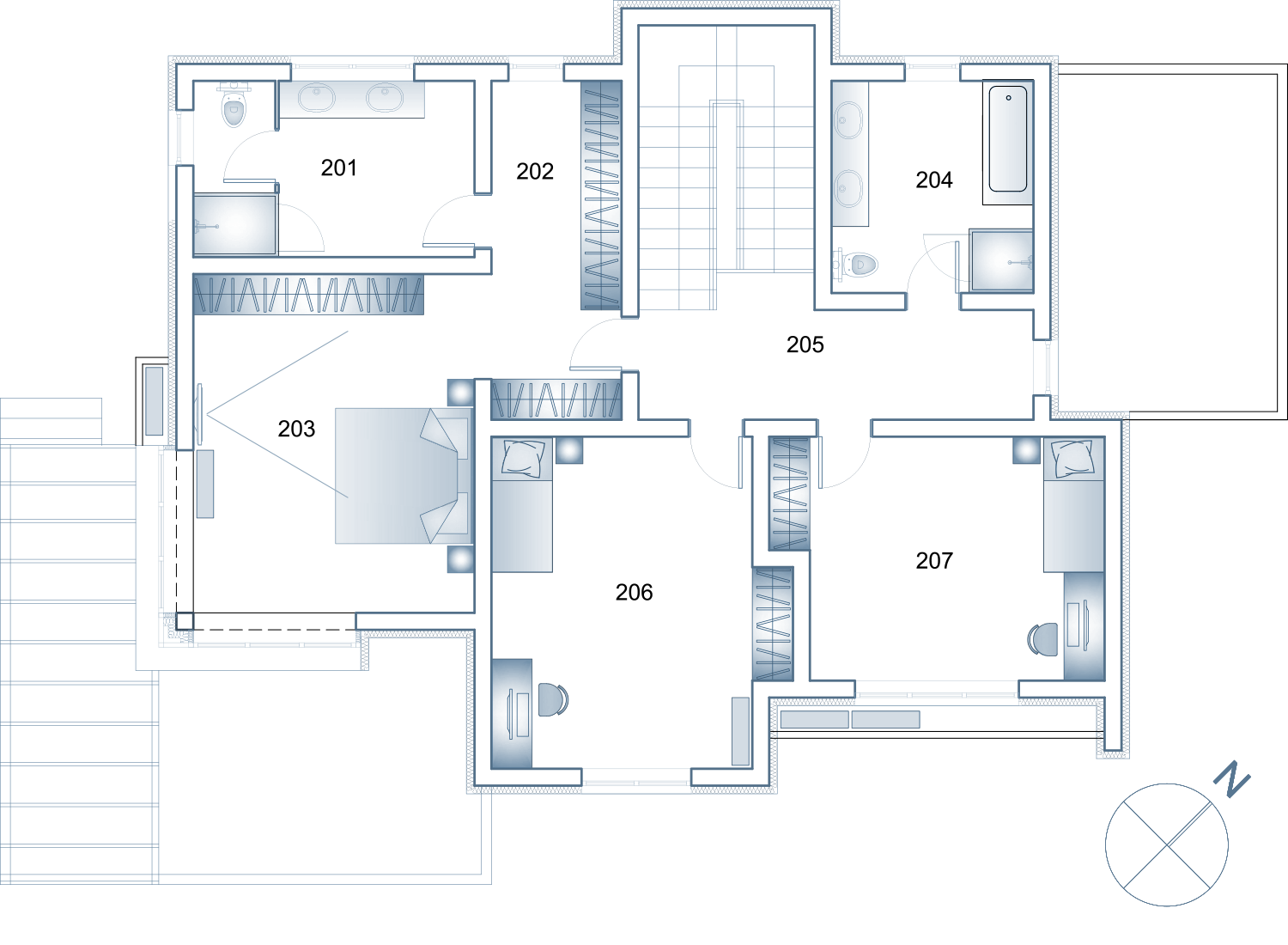 There are three bedrooms with dedicated bathrooms on the second floor. The master bedroom is facing south. It has a walk-in closet through which you can access the master bathroom. The large bathroom and walk-in closet are illuminated by natural light. You can see the design element from the kitchen here again: a corner window that offers a panoramic view of the Vitosha mountain.